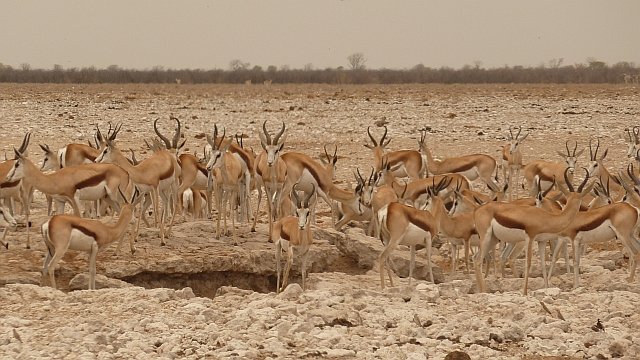 Gnu-Herde am Wasserloch; oben die ausgetrocknete Etosha-Pfanne