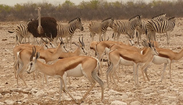 Springböcke, Strauss und Zebras