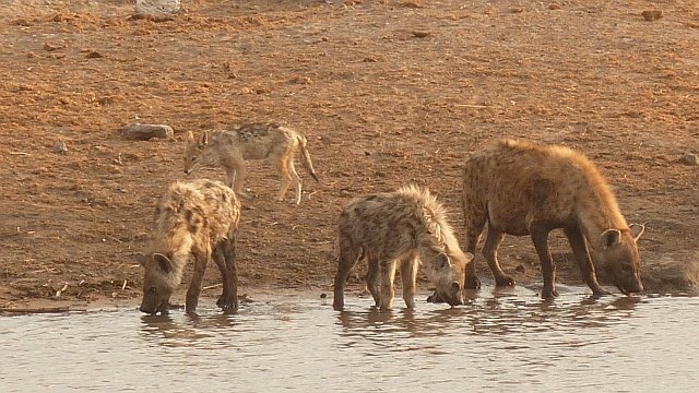 Durstige Hyänen-Familie, hinten Schabrackenschakal