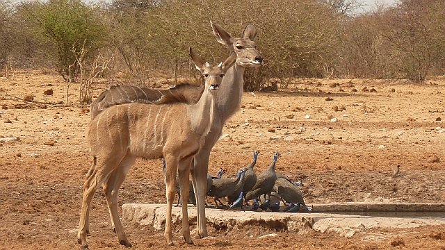 Kudu-Schwestern mit Perlhühnern