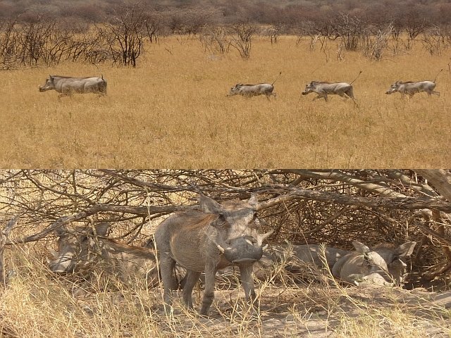 Warzenschwein-Mutti mit Ferkeln auf der Flucht und beim Nickerchen