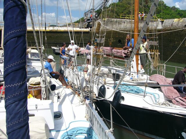 zwei anderen Booten endlich auf den Weg Richtung Gatun-Schleuse machen.