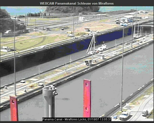Pedro Miguel, und der Lotse draengt mit Funkgeraet und Stoppuhr in der Hand auf Einhaltung des minutengenauen Fahrplans.