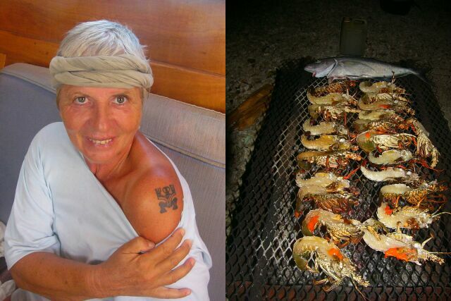 Links stolz mit ausgeheiltem Tattoo; rechts leckere Langusten auf Gastons Grill. Toau